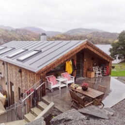 Utvendig kledd med Kebony, PVC tekking med profiler på tak.