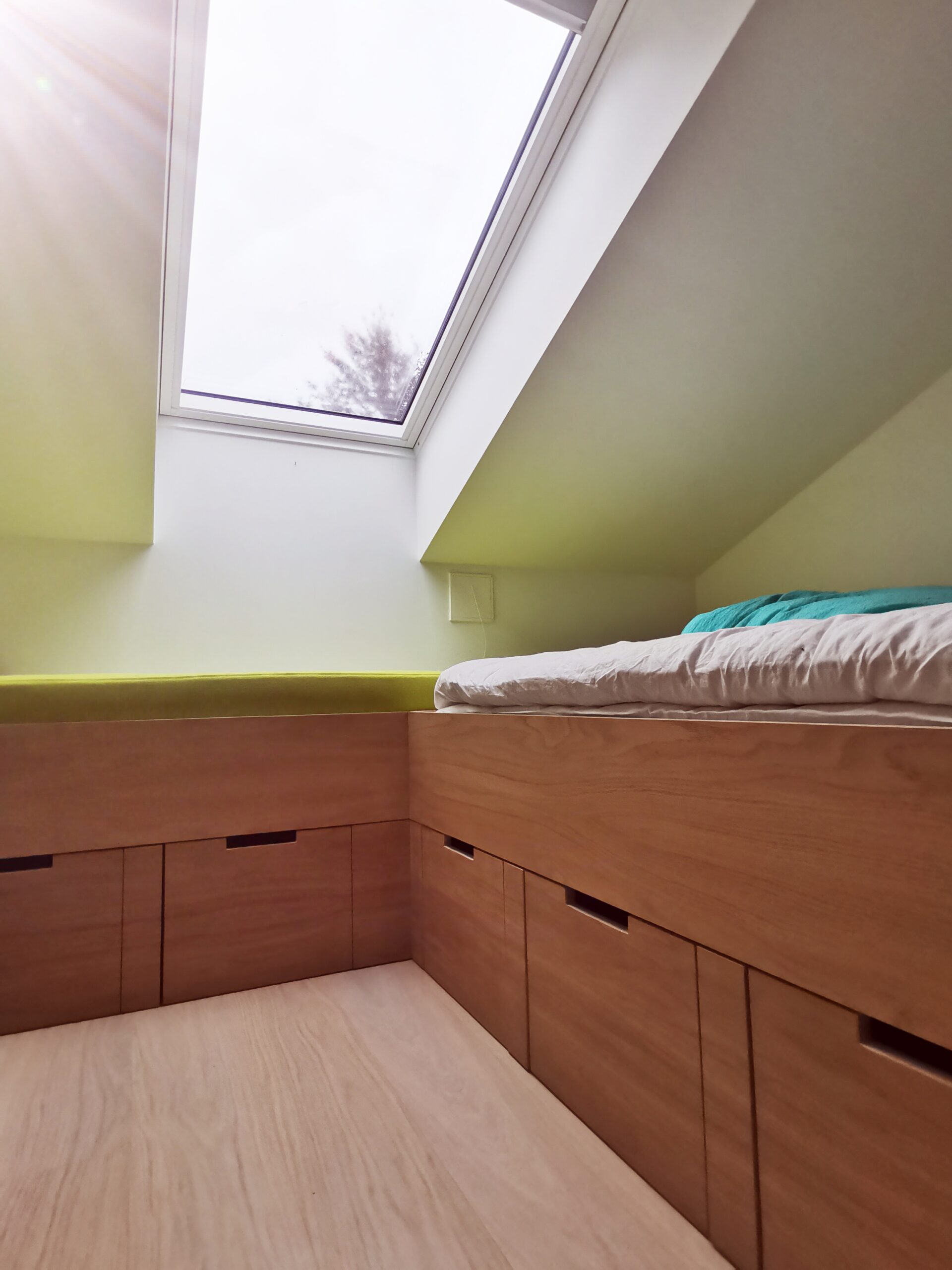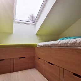 Vi har plassbygget senger for best mulig utnyttelse av soverom, smart oppbevaring under senger.